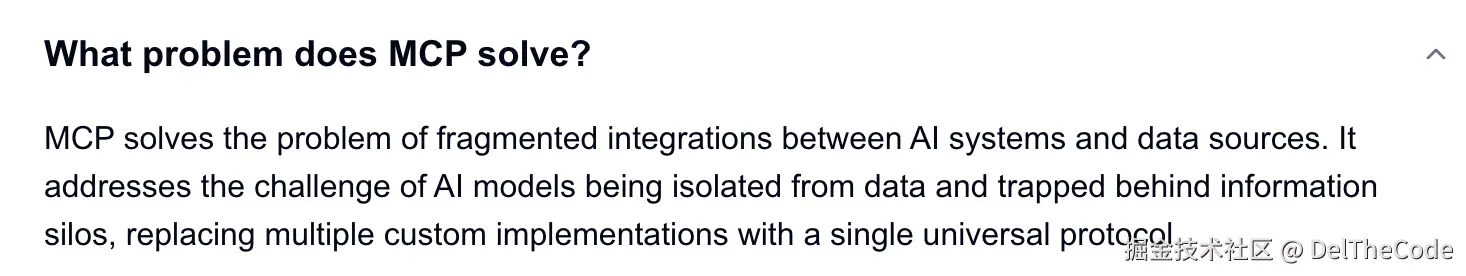 MCP解决了AI和数据源之间碎片化集成的问题。它解决了AI与数据隔离并被困在信息孤岛后面的挑战,用一个通用协议取代了多个自定义实现。