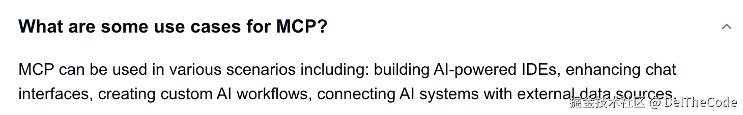MCP可用于各种场景,包括:构建AI驱动的ide,增强聊天界面,创建自定义AI工作流,将AI系统与外部数据源连接起来。
