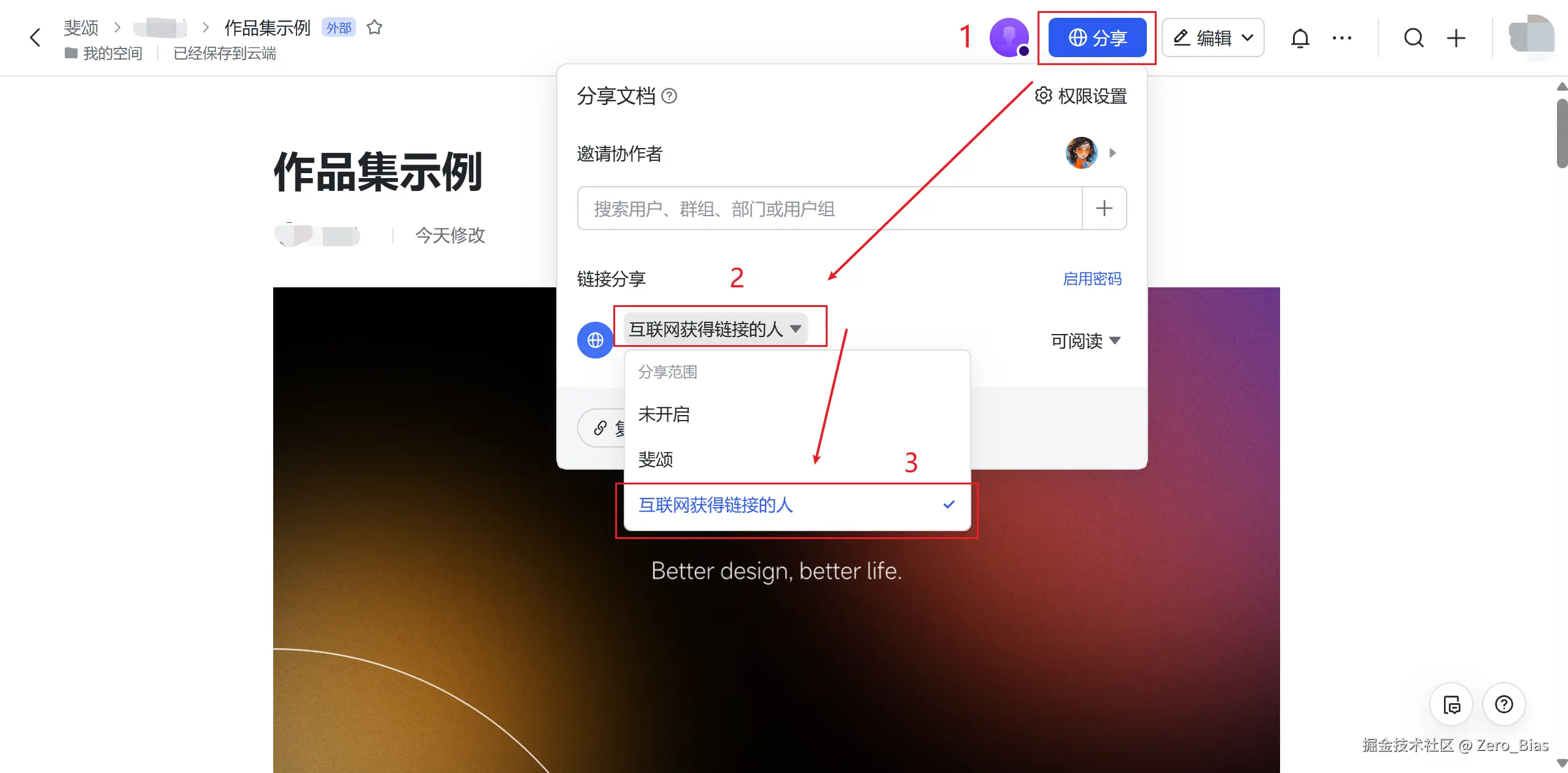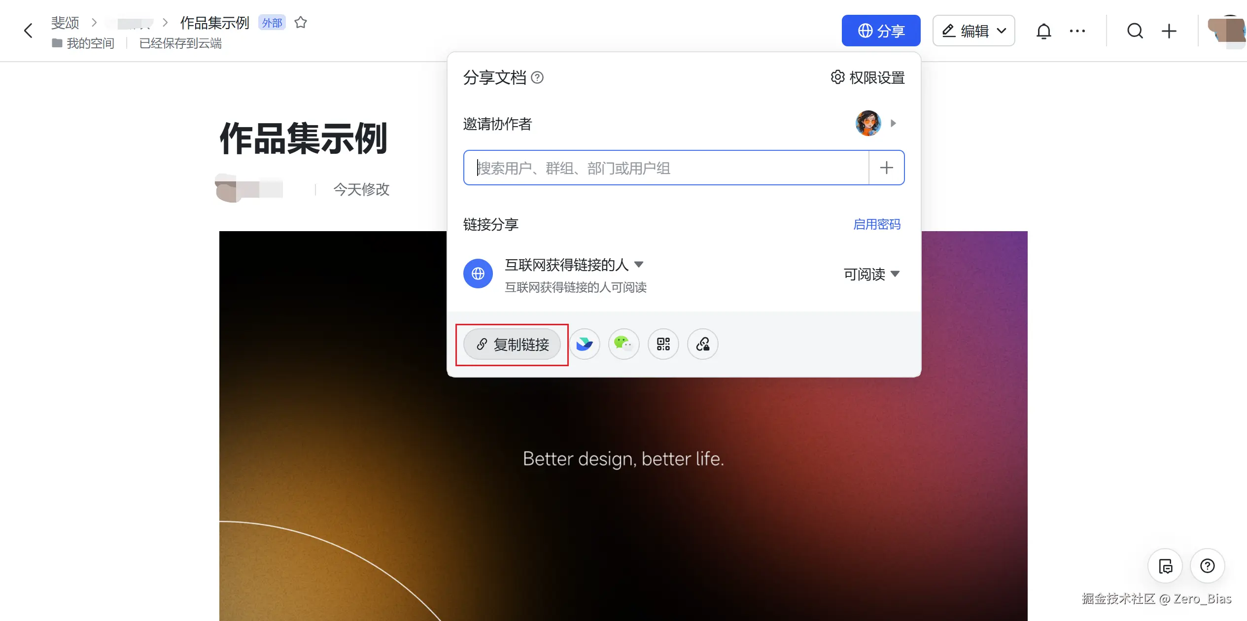 1.将做好的作品集上传至飞书云文档,点击分享设置权限