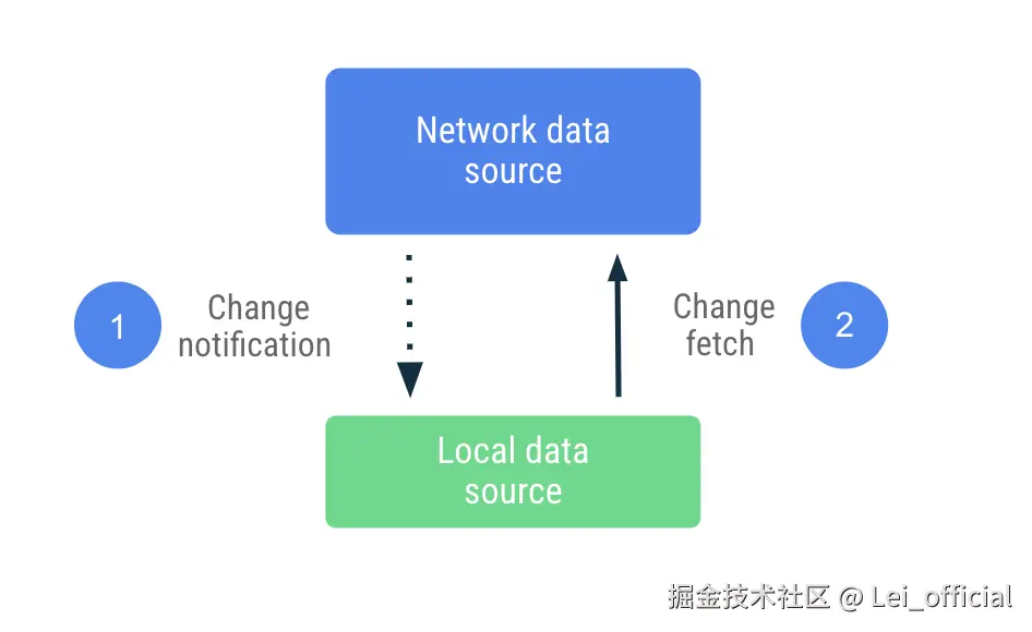 在基于推送的数据同步中,应用本地维护了完整的数据备份,以便在离线状态下使用。同时,当网络服务器数据发生变化时,会 推送 变化通知给客户端,再由客户端本地数据源对新数据执行拉取操作。