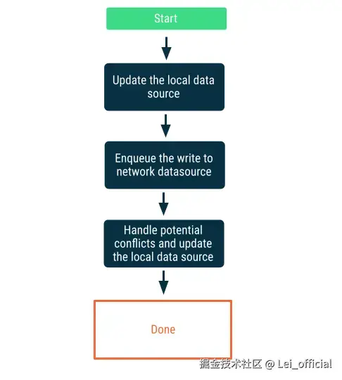 首先写入本地数据源,然后将写入操作加入队列,以便尽快通知网络数据源。这种实现方式存在一个潜在的风险 —— 当应用恢复在线时,网络和本地数据源之间可能会发生冲突。下一节将详细介绍冲突解决。