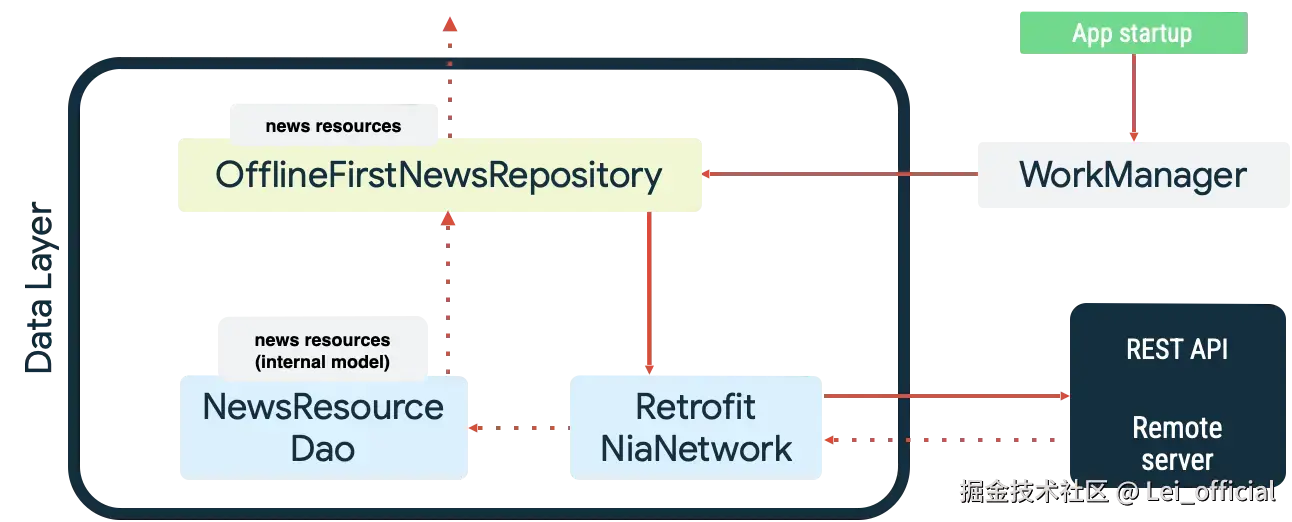 在上图中, WorkManager 负责在应用启动时拉取最新数据,并将最新数据更新到本地数据源中,以供上层业务使用。