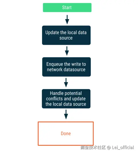 首先写入本地数据源,然后将写入操作加入队列,以便尽快通知网络数据源。这种实现方式存在一个潜在的风险 —— 当应用恢复在线时,网络和本地数据源之间可能会发生冲突。下一节将详细介绍冲突解决。