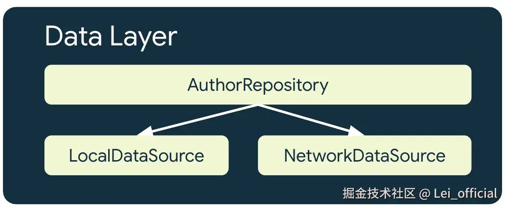 以 NowInAndroid 中的“文章作者”为例,在本地使用 AuthorEntity,对应 Room 数据库中的 Entity,网络数据则使用 NetworkAuthor 类。向上层业务暴露出的是业务模型 Author。