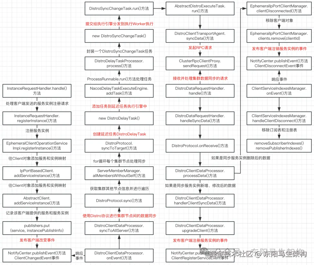 在执行DistroClientDataProcessor的processData()方法时,如果是同步服务实例新增、修改后的数据,则执行DistroClientDataProcessor的handlerClientSyncData()方法。该方法会和处理服务注册时一样,发布一个客户端注册服务实例的事件。如果是同步服务实例删除后的数据,则调用EphemeralIpPortClientManager的clientDisconnected()方法。首先移除客户端对象信息,然后发布一个客户端注销服务实例的事件。