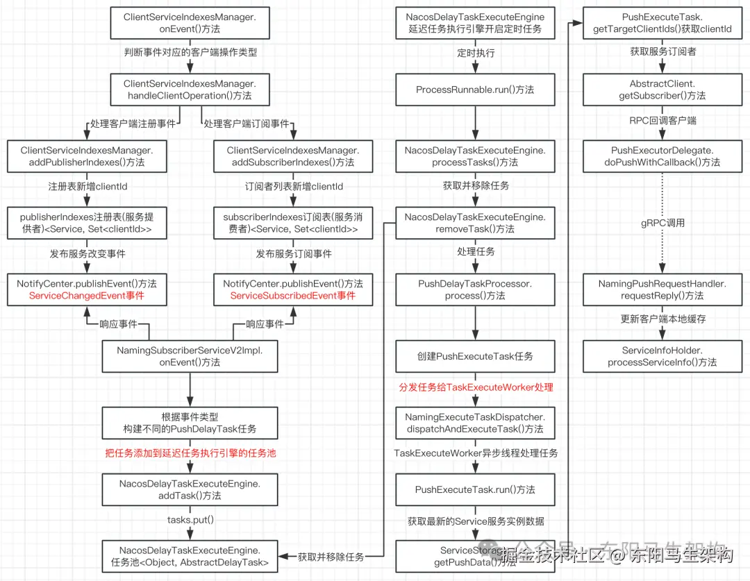 Nacos客户端注册服务实例时,Nacos服务端会发布ClientRegisterServiceEvent客户端注册服务实例事件。Nacos服务端在处理客户端注册服务实例事件时,会把clientId写入到注册表,然后接着发布ServiceChangedEvent服务改变事件。