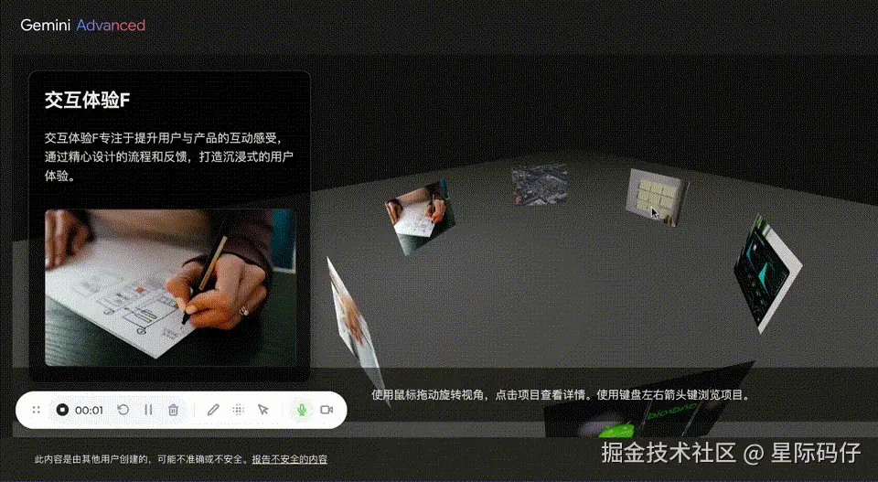 我们要求 Gemini 创建一个交互式的 3D 作品集网站。