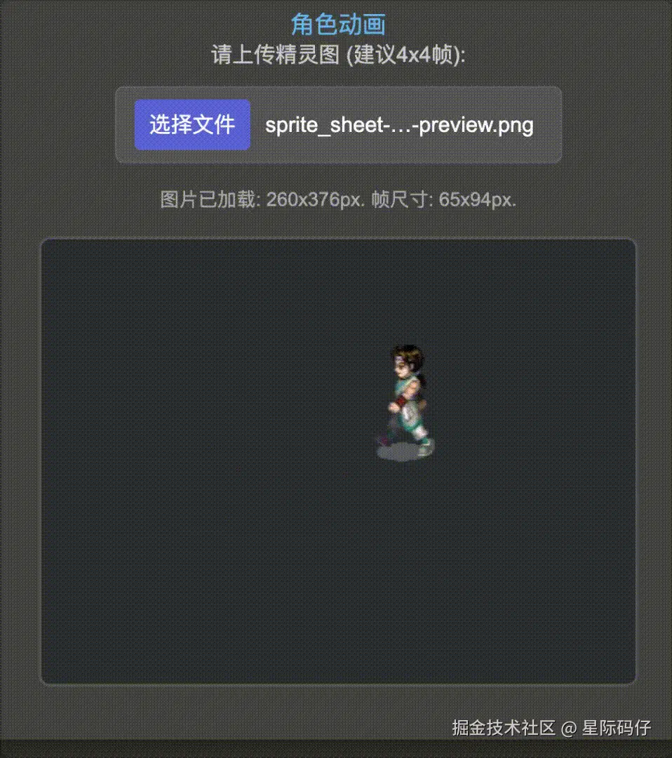 随后,基于这些处理后的图像资源,生成一个 2D 角色行走动作的调试界面,用户可通过界面右下角的虚拟方向键控制角色移动。