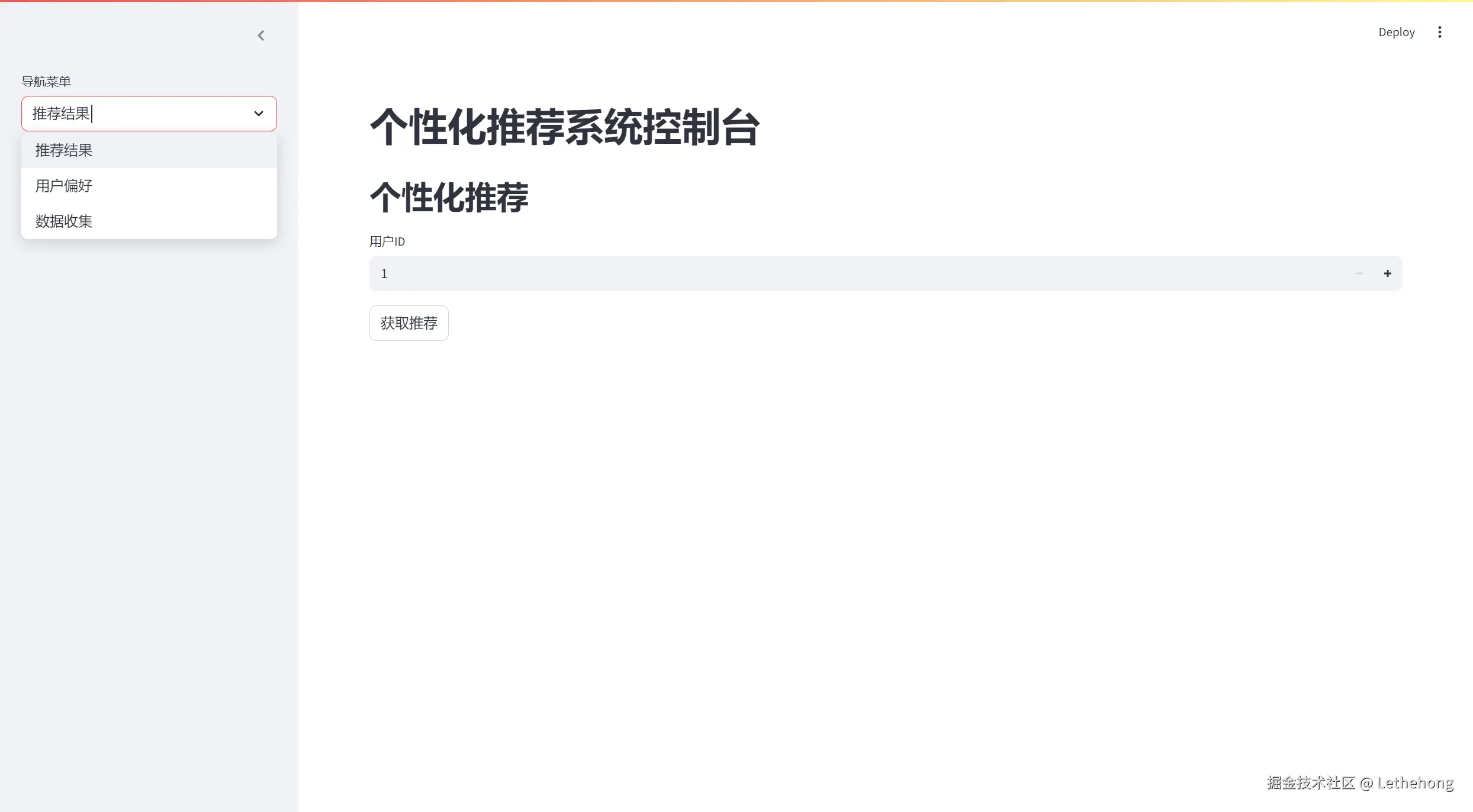 recommendation-system/ │ ├── recommendation_system/ # 主Python包 │ ├── __init__.py # 包初始化文件 │ │ │ ├── api_gateway/ # API网关服务 │ │ ├── main.py # FastAPI应用入口 │ │ ├── __init__.py │ │ └── Dockerfile # 容器化配置(端口:8000) │ │ │ ├── data_collector/ # 数据收集服务 │ │ ├── main.py # 数据源连接器实现 │ │ ├── __init__.py │ │ └── Dockerfile # 容器化配置(端口:8001) │ │ │ ├── recommendation_service/ # 推荐算法服务 │ │ ├── main.py # 推荐算法实现 │ │ ├── __init__.py │ │ └── Dockerfile # 容器化配置(端口:8002) │ │ │ ├── user_preference_service/ # 用户偏好服务 │ │ ├── main.py # 用户数据管理 │ │ ├── __init__.py │ │ └── Dockerfile # 容器化配置(端口:8003) │ │ │ └── visualization/ # 可视化界面 │ ├── main.py # Streamlit应用入口 │ ├── __init__.py │ └── Dockerfile # 容器化配置(端口:8501) │ ├── tests/ # 测试目录 │ ├── integration/ │ │ └── test_end_to_end.py # 端到端集成测试 │ │ │ ├── test_api_gateway.py # API网关单元测试 │ ├── test_data_collector.py # 数据收集测试 │ ├── test_recommendation_service.py # 推荐算法测试 │ ├── test_user_preference_service.py # 用户偏好测试 │ └── test_visualization.py # 界面组件测试 │ ├── docker-compose.yml # 多容器编排配置 ├── setup.py # Python包配置 ├── requirements.txt # 项目依赖列表 ├── .env # 环境变量配置 └── README.md # 项目文档