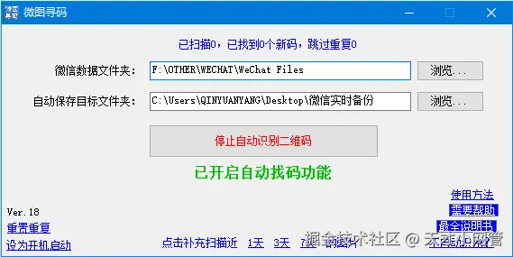 十五,软件同时也有跳过重复的功能,该功能默认启用,可以手动重置,到这里你已经学会了如何自动提取微信收到的二维码图片了,简单又方便