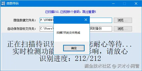 十一,这个软件建议设置为开机自动启动,这样只要电脑打开,软件就会跟着打开,不会错过收到的图片,如果你确实是忘记打开了,而微信又收了很多图片,软件也允许你对历史收到的图片补充扫描,最长可以补充扫描7天内的