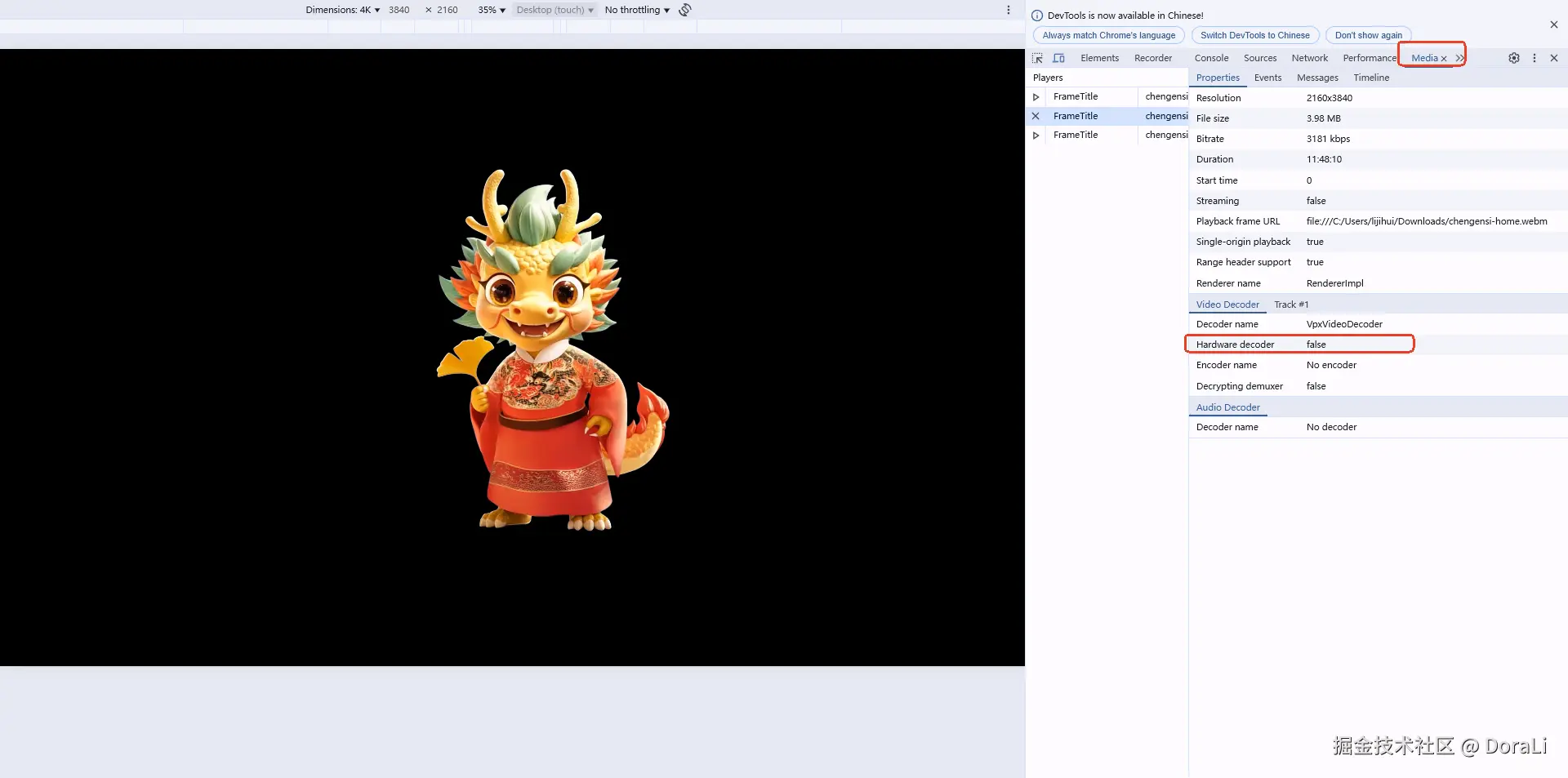 在chrome中打开调试,查看一下hardware decoder,如果是false,就是软解码。