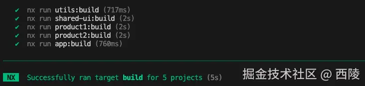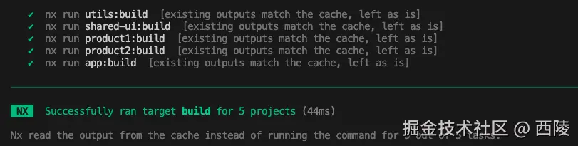 如果 Nx 未找到相应的计算哈希,Nx 将运行任务,并在任务完成后,获取输出和终端日志并将其存储在本地下面通过运行以下命令两次来查看 Nx 缓存的效果:
