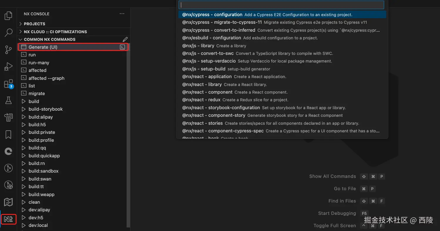 Nx Console 是一个 IDE 扩展,可以在这里下载安装包。Nx Console 提供了直观的图形化界面,无论是创建应用程序、生成组件、运行测试,还是构建项目,开发者只需要通过简单的按钮和表单即可完成,而不需要记住或输入复杂的 CLI(命令行)命令。