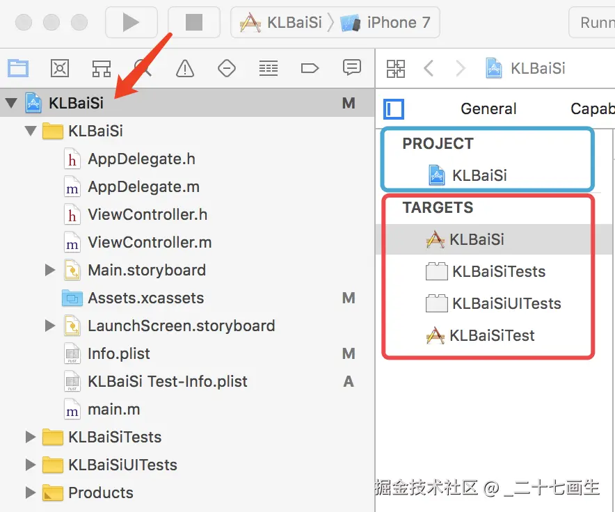 首先,iOS项目的开发环境搭建主要就是基于我们项目的Project 和 Targets进行展开的。那么,这两个东西到底是啥玩意呢?我们点击我们的项目名,就会出现下图所示的界面。从图片中可以看到,在项目导航面板的右侧面板上有蓝色和红色框所示的PROJECT和TARGETS两部分。