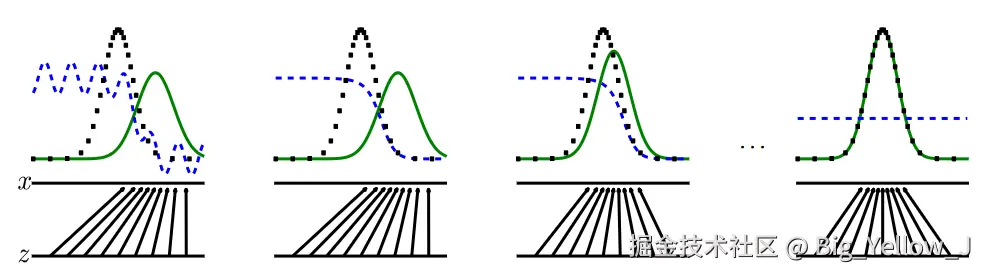 从左到右边:最开始生成模型所生成的效果不佳,判别模型可以很容易就判断出哪些是正式数据哪些是生成数据(蓝色线条代表判别模型给出的评分,最开始很容易判断出哪些是生成数据哪些是正式数据),但是随着模型迭代,生成模型所生成的内容越来越贴近正式的数据分布进而导致判别模型越来越难以判断。