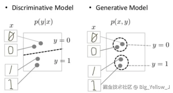 其中:判别模型会尝试在数据空间中划定边界,而生成式模型会尝试对数据在整个空间中的放置方式进行建模