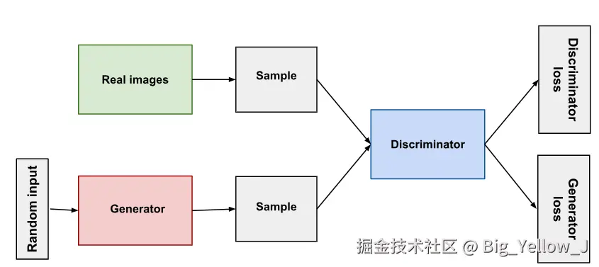 GAN训练过程分为两部分:第一部分学习优化判别器;第二部分学习优化生成器。模型架构: