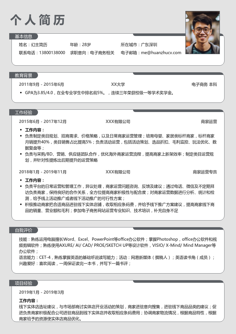 专业的个人简历模板,逻辑清晰,排版简洁美观,让你的个人简历显得更专业,找到好工作。希望这份电子商务商家运营简历模板简历范文可以帮助到你,文末可直接点击在线编辑哦~