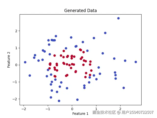 上述代码生成了 100 个符合标准正态分布的二维数据点,并且根据这些点是否在单位圆内,为每个点分配了一个标签。如果点在单位圆内,标签为 1;如果点在单位圆外,标签为 0。这就形成了一个简单的二分类数据集。