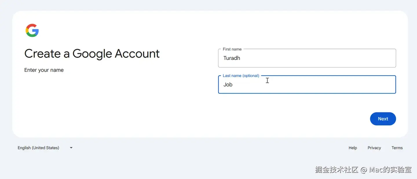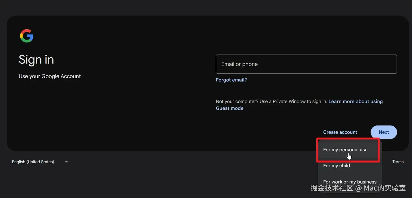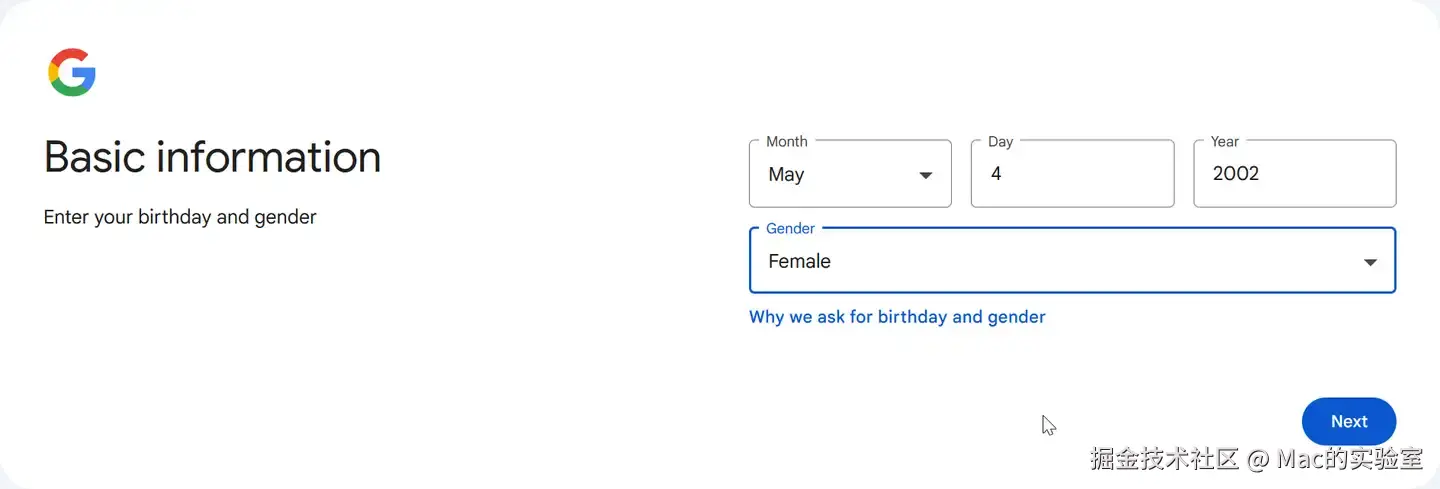 第二步,我们需要创建一个谷歌账户,选择为个人而创建,然后输入姓名和生日,注意生日一定要是成年的,否则GEE是不允许未成年使用的。