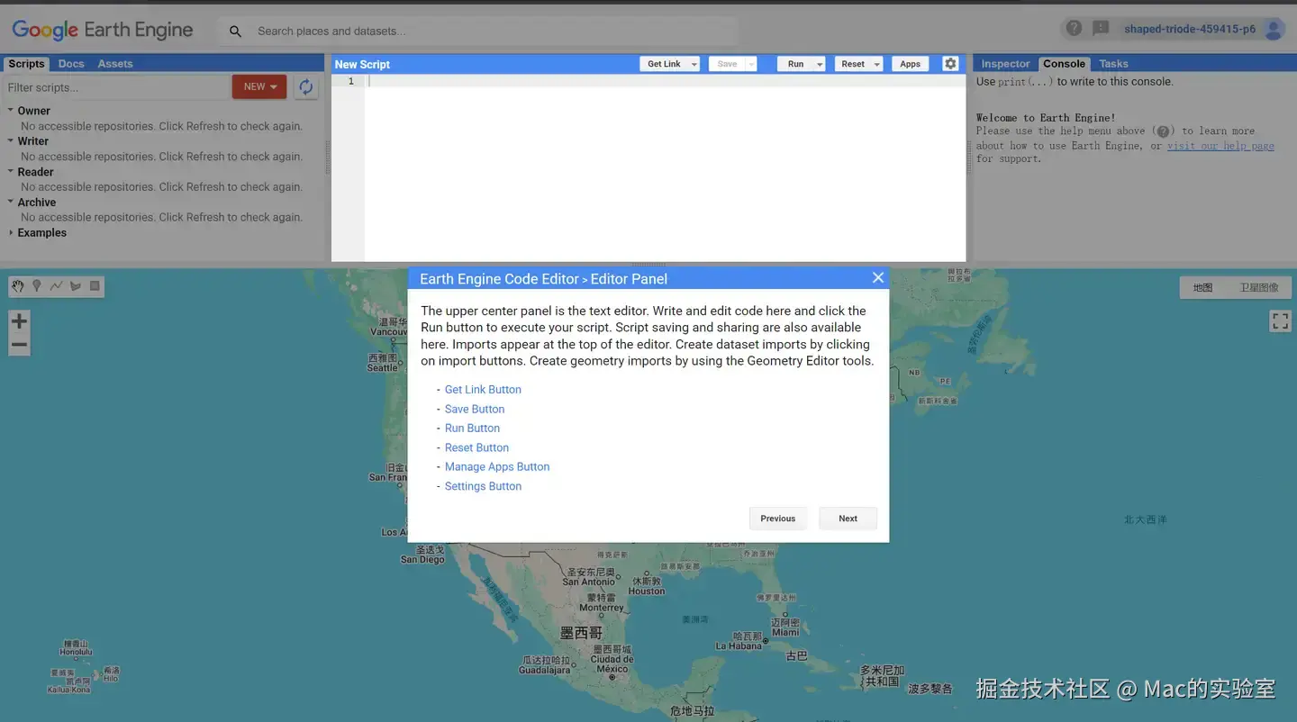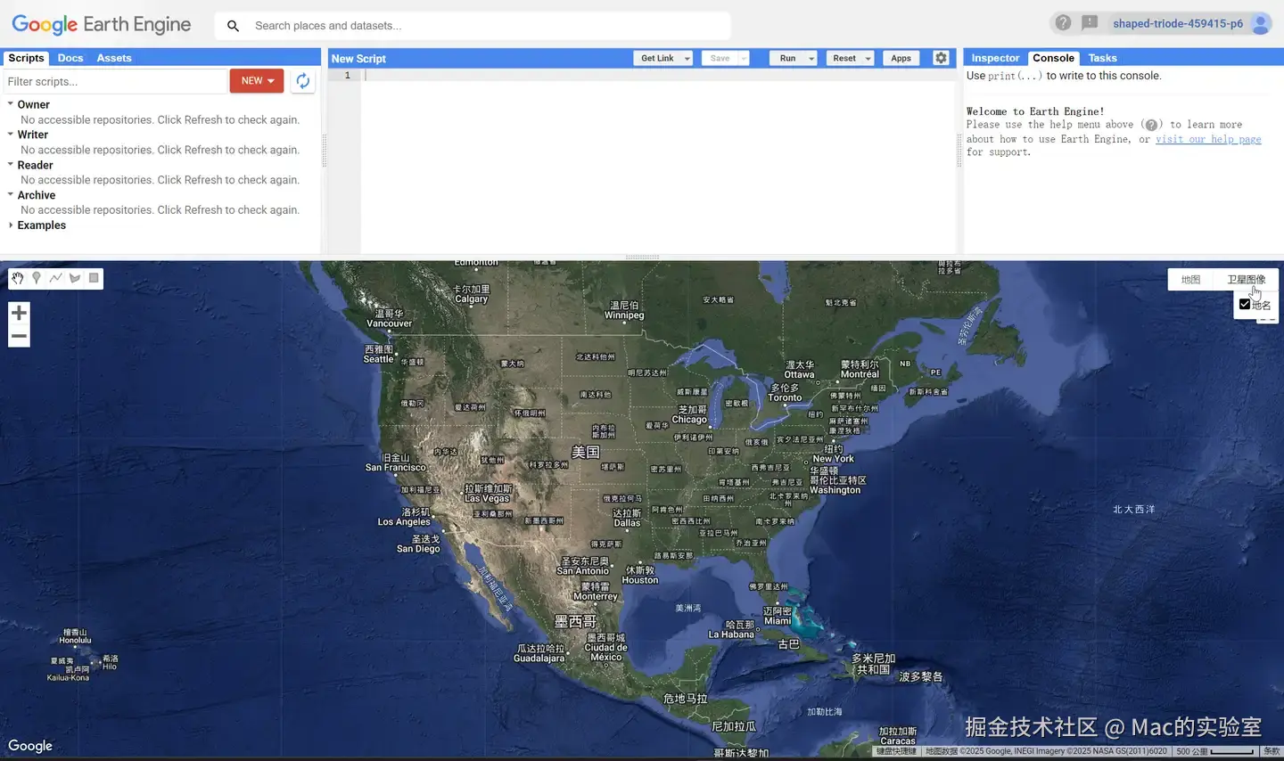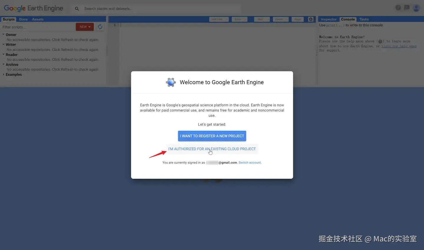 第七步,完成配置信息注册后,我们打开GEE去检验:code.earthengine.google.com/