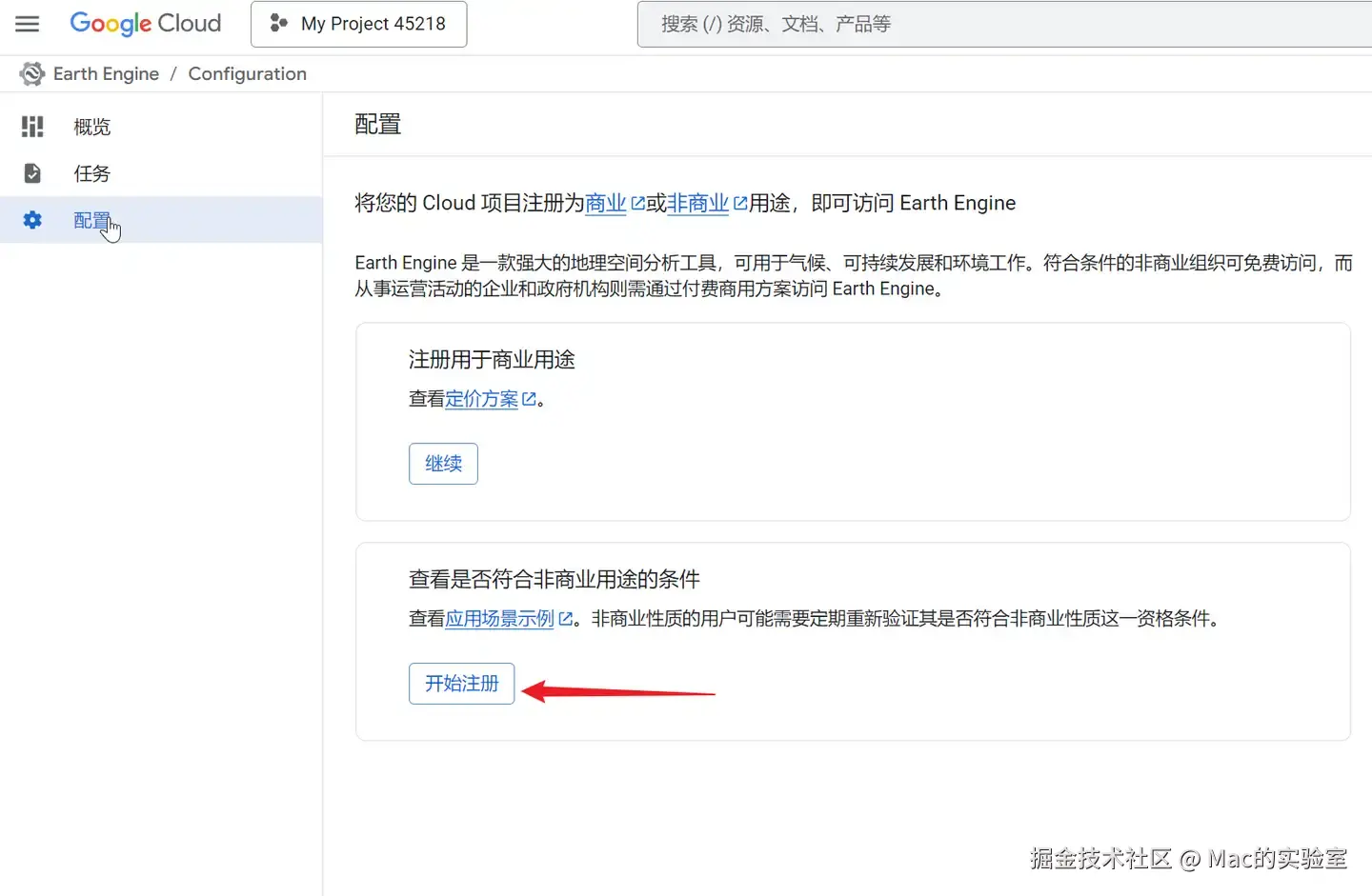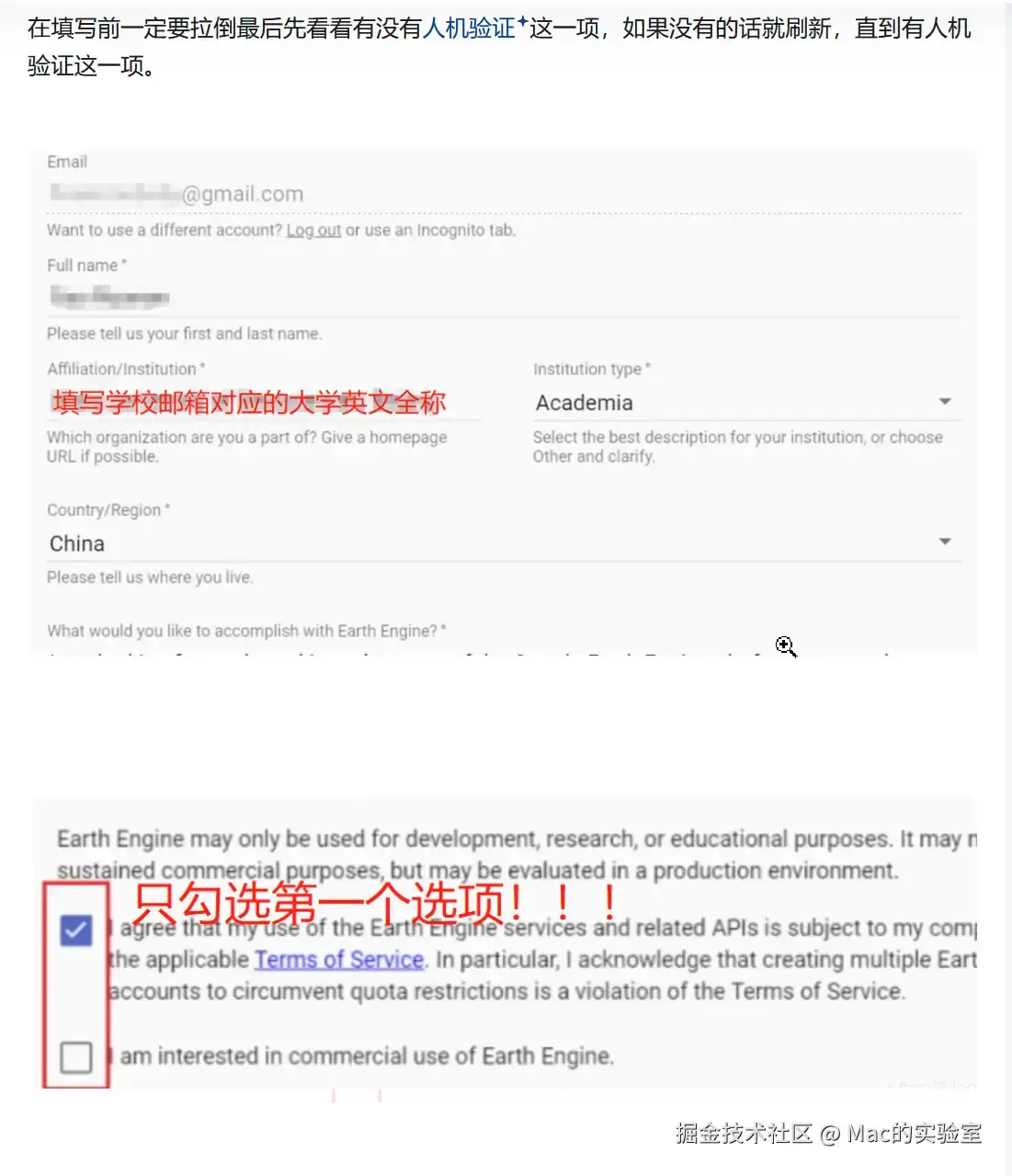 总结 1:在注册GEE账号之前,你需要拥有一个Googl账号,谷歌账号可以使用自己的手机号到谷歌官网注册获得。 2:在使用谷歌账号授权使用GEE之前,需要注册配置信息,建立一个project才能使用GEE。 3:注册配置信息需要填写GEE问卷。(1)必须写自己是全球性非盈利项目研究;(2)机构填写自己学校英文缩写,如实写就好;(3)研究类型随便选,气候or农业等;(4)不要勾选商业选项。