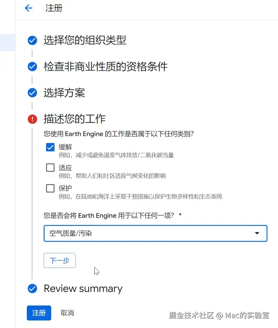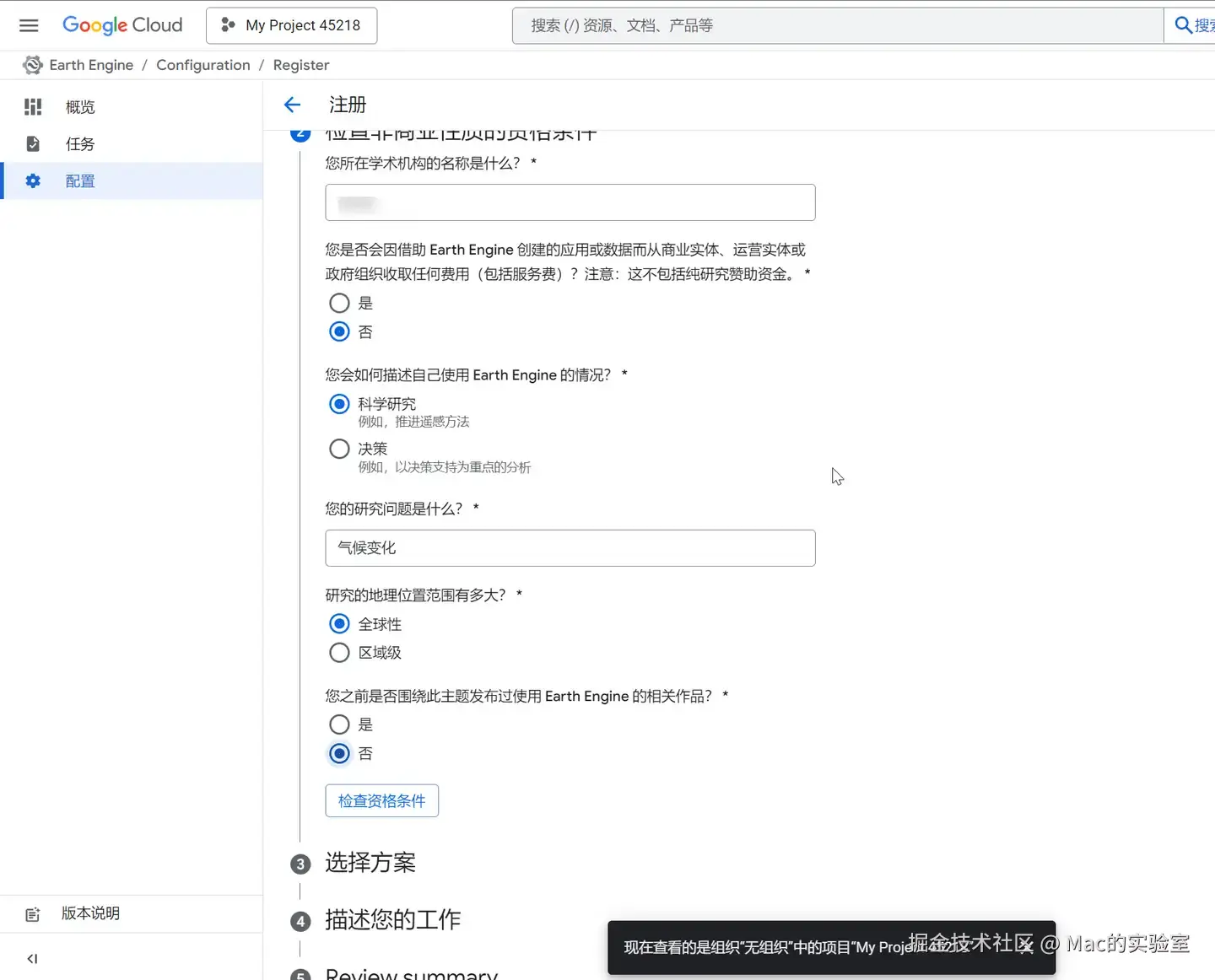 学术机构名字,填自己学校英文名缩写,下面选项一律选否,研究问题选【气候】【科学研究】这些都是GEE的问卷调查形式,随便填就行,没什么严格要求。