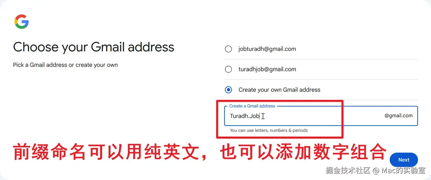 第三步,设置一个Gmail命名,可以是纯英文,也可以添加数字组合,按自己易记的方式取名即可,然后输入设置的密码