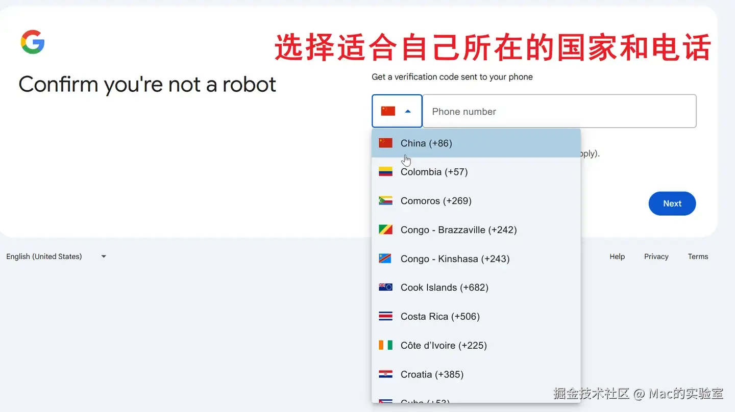 第四步,谷歌需要手机号验证,选中国,+86输入自己手机号验证即可