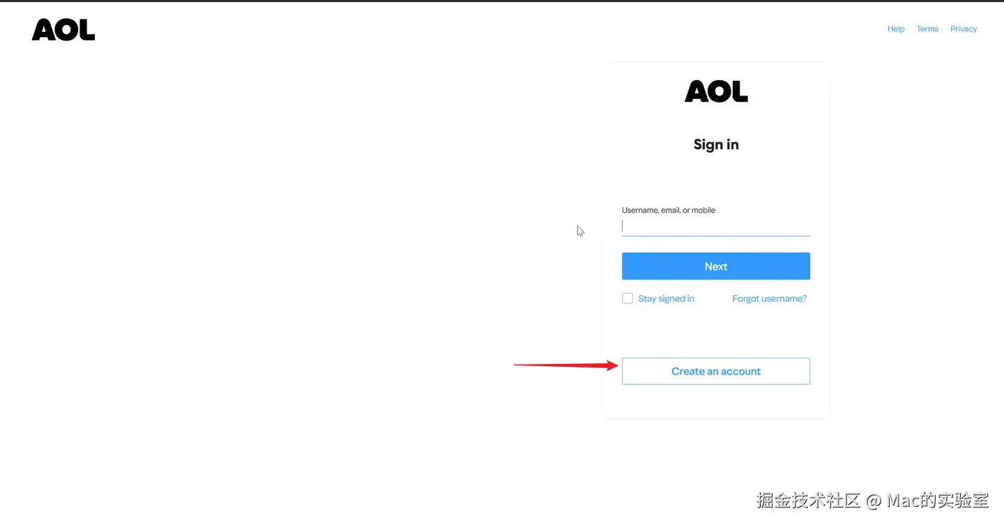 首先第一步打开Aol邮箱官网:mail.aol.com 点击Create an account 创建账号