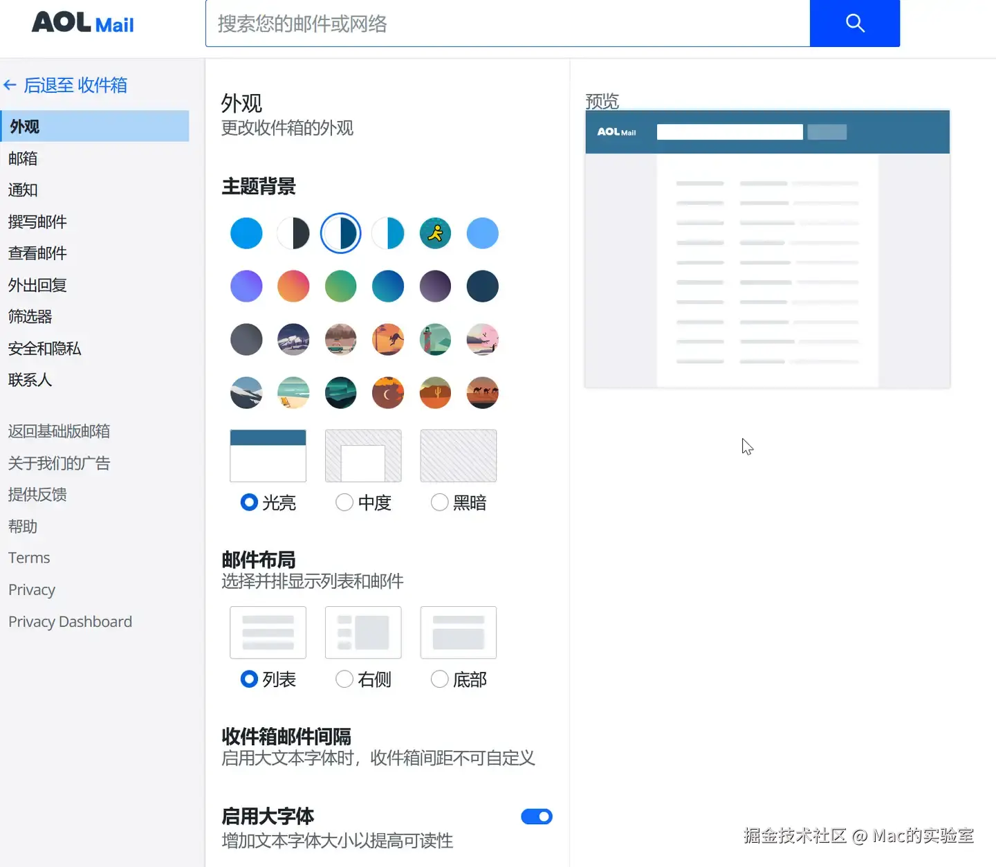进入 AOL 邮箱后台页面,对于首次访问的用户,会弹窗提示你自定义修改界面样式: