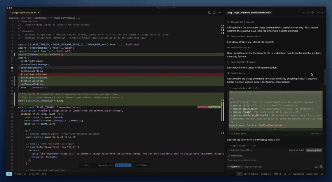 在新的内联模式下,我们可以基于Full File Edits对整个文件进行风格统一优化同时生成必要的文档,而不必要像旧版Cursor的Inline Edit那样进行碎片化调整。接着,对核心逻辑进行重构时,我们可以先在内联模式下尝试一个初步的、简洁的指令,如:“初步优化此函数的可读性”。如果我们评估后认为任务的复杂度超出了简单内联修改的范畴,或者初步建议不够深入,此时可以无缝利用新增的“发送给代理处理”**选项,点击“发送给代理处理”,当前选中的代码以及初步的编辑意图(如果有输入)会自动传递给更强大的 AI 代理进行处理。这让我们与AI协同的工作流更加丝滑。