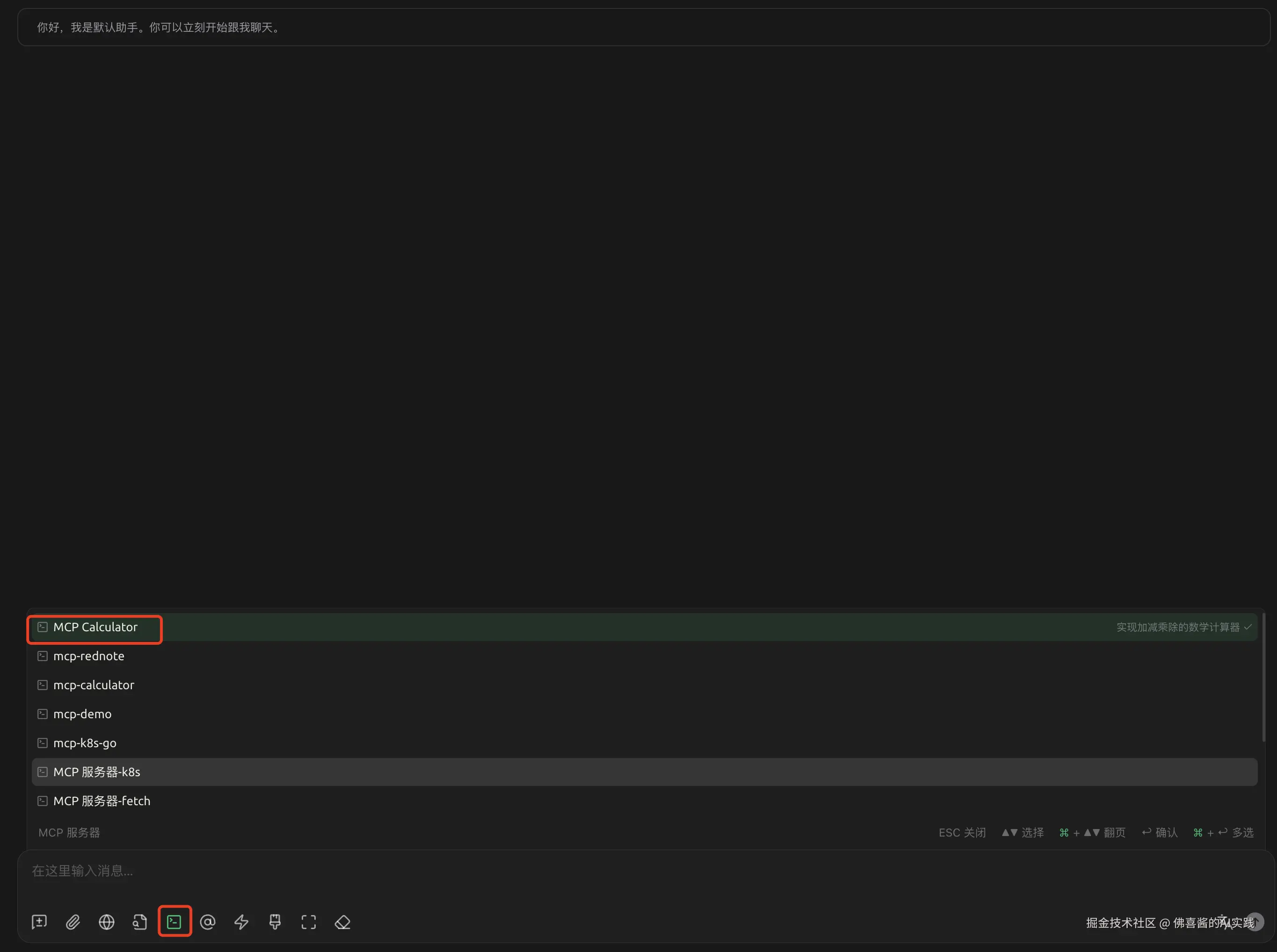 启动MCP Server没有问题之后,我们在会话里面选择MCP Calculator