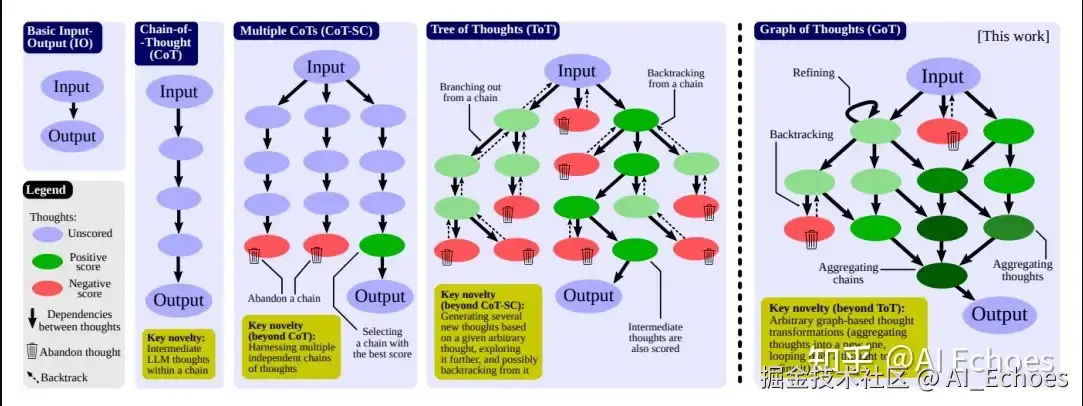 7. Graph of Thoughts:同时支持多链、树形以及任意图形结构的Prompt方案,支持各种基于图形的思考转换,如聚合、回溯、循环等,这在CoT和ToT中是不可表达的。将复杂问题建模为操作图