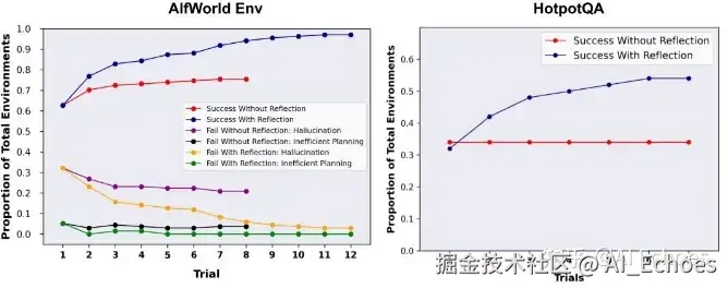 AlfWorld Env 和 HotpotQA 实验。在 AlfWorld 中,幻觉是比低效规划更常见失败因素。