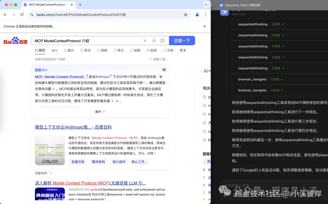 可以看到AI执行过程中遵循了 sequentialthinking -> browser -> sequentialthinking 流程,并通过Chrome浏览器检索MCP信息