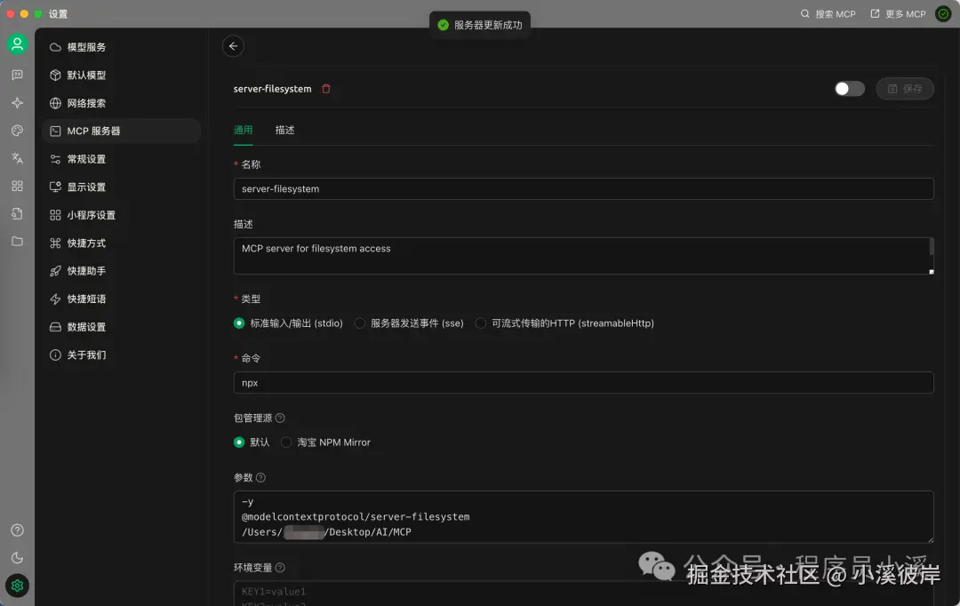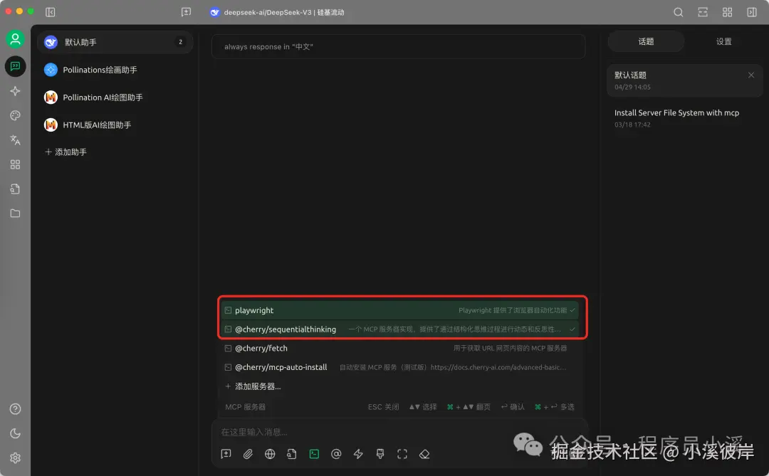 在对话框中勾选需要的server-filesystem,这样AI才能发现和调用对应MCP服务