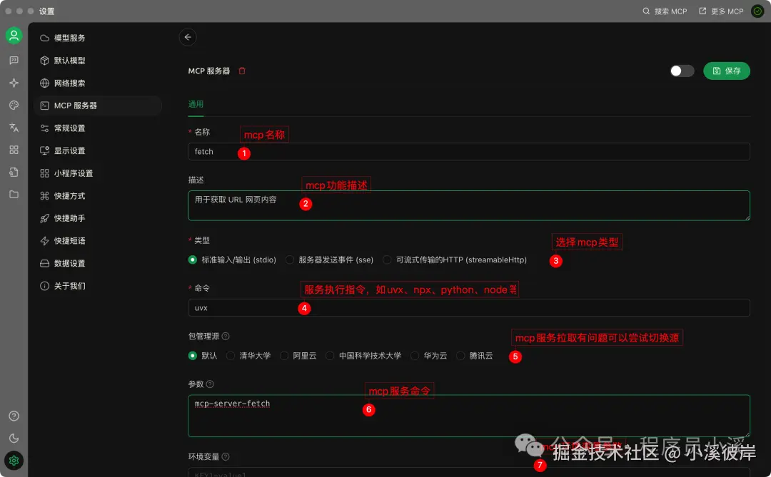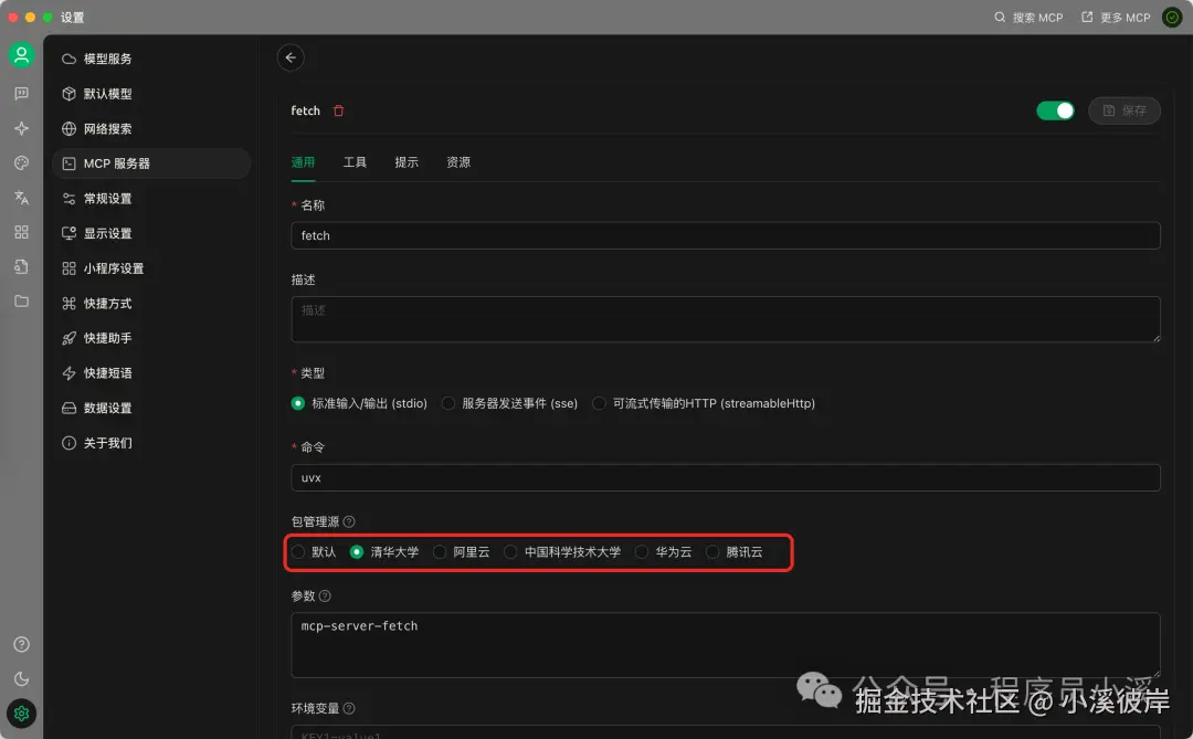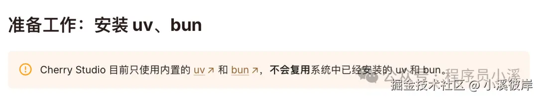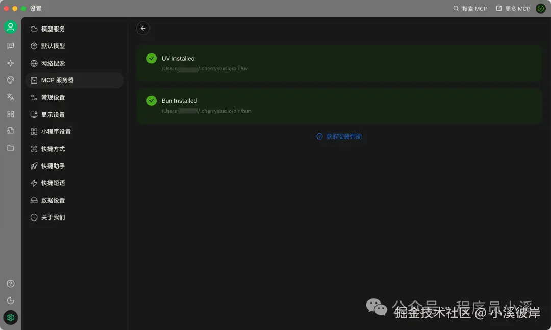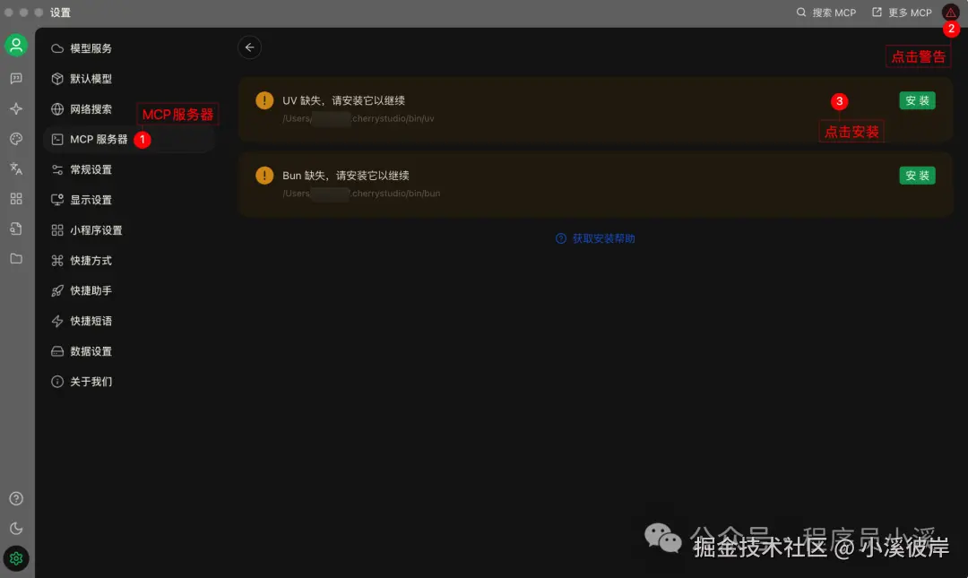 首次使用MCP服务需要安装Cherry Studio下的环境配置,不会复用本地安装的环境,下面是官网的提示