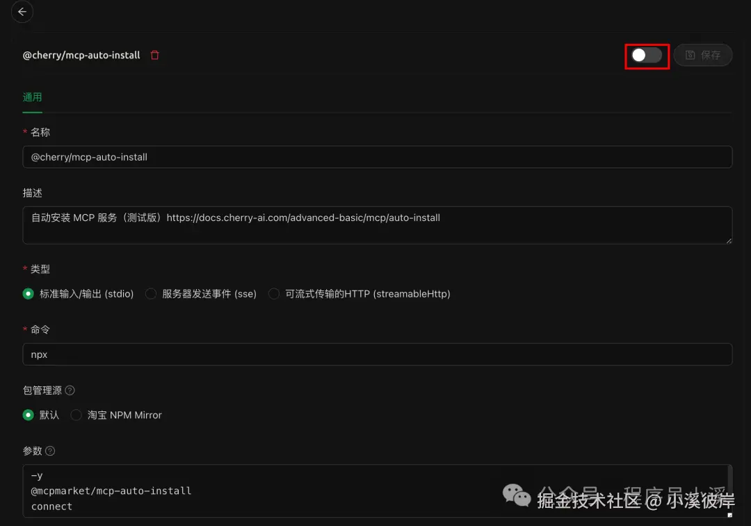 在Cherry Studio客户端MCP服务器列表即可看到安装的MCP服务,只需进入MCP详情打开MCP开关即可使用