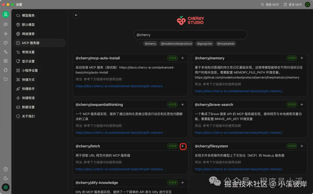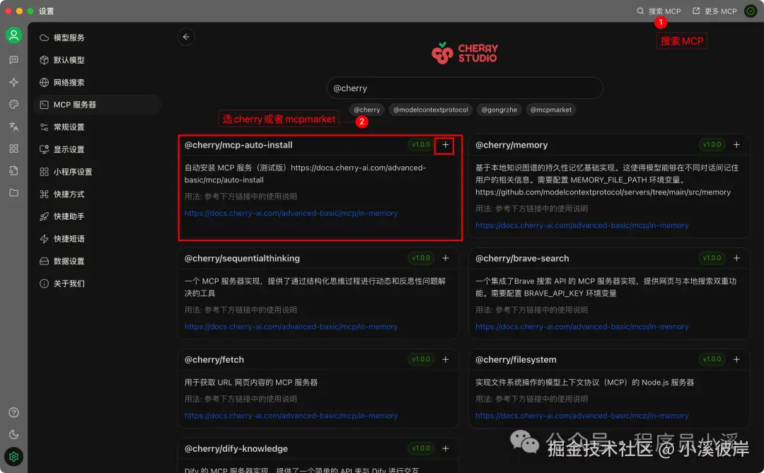 在 Cherry Studio 内置MCP市场选项【@cherry】或者【@mcpmarket】搜索源进行搜索,然后点击【+】进行添加