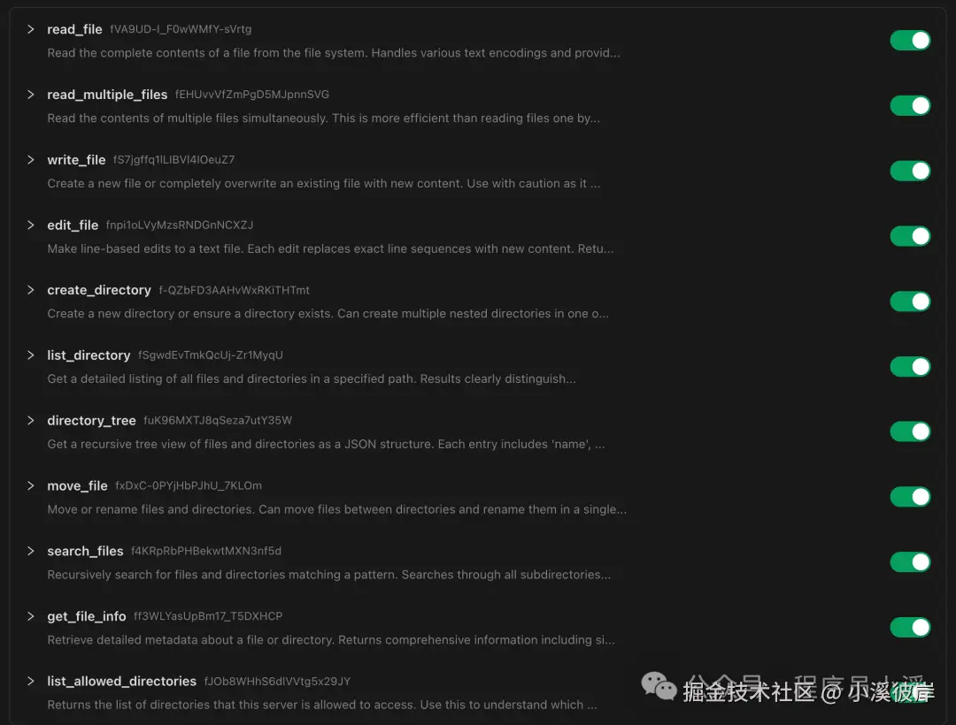 启用成功后可以在【工具】查看Filesystem MCP提供的可用工具