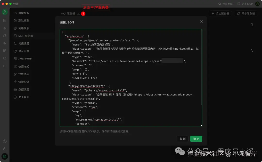 如果对Cherry Studio MCP JSON格式配置熟悉的话,也可以直接通过JSON配置,这种形式有时可以避免一些Cherry Studio可视化配置MCP的一些异常问题
