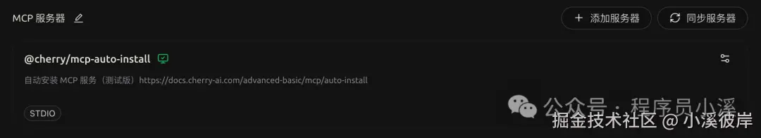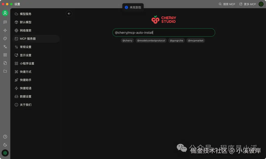 从Cherry Studio提供的MCP市场安装MCP,这种方式相对比较简单、稳定,手动配置方式容易出现各种安装超时问题。找到MCP服务后,点击右上角的【+】即可添加成功