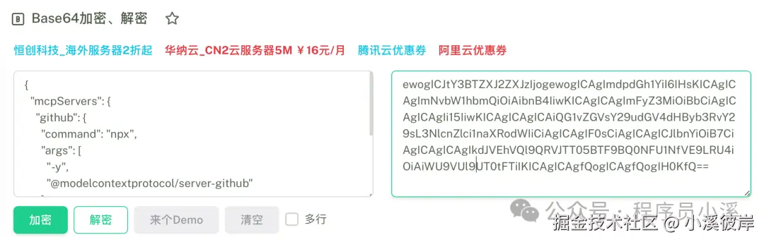 将上面配置信息(注意将Github Token替换为自己的token)粘贴到 https://www.json.cn/base64/ 进行base64编码