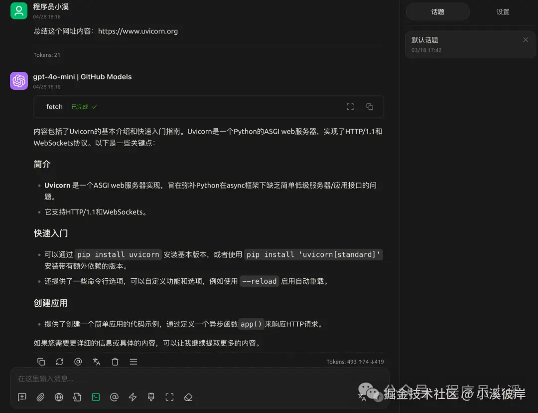 输入提示词如 "总结这个网址内容:www.uvicorn.org",AI就会先调用MCP服务获取链接内容,然后根据获取到的内容进行总结