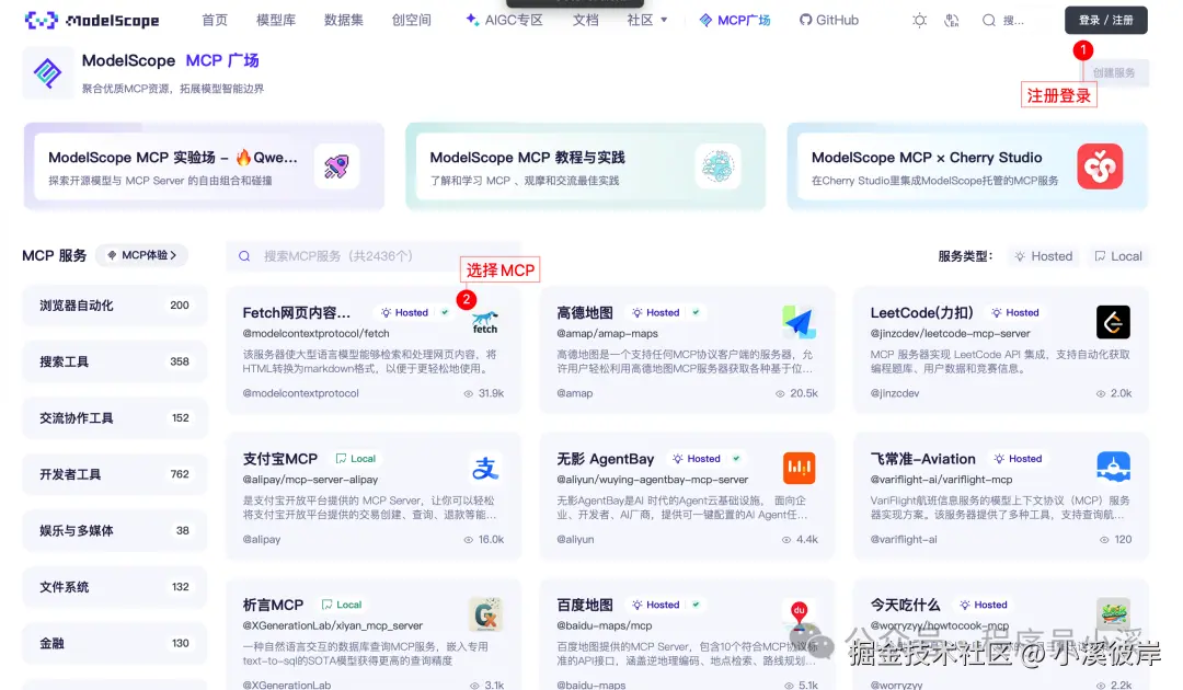 Cherry Studio提供了从 内置MCP市场、手动配置、自动配置 和 魔搭社区 同步4种方式安装MCP服务。