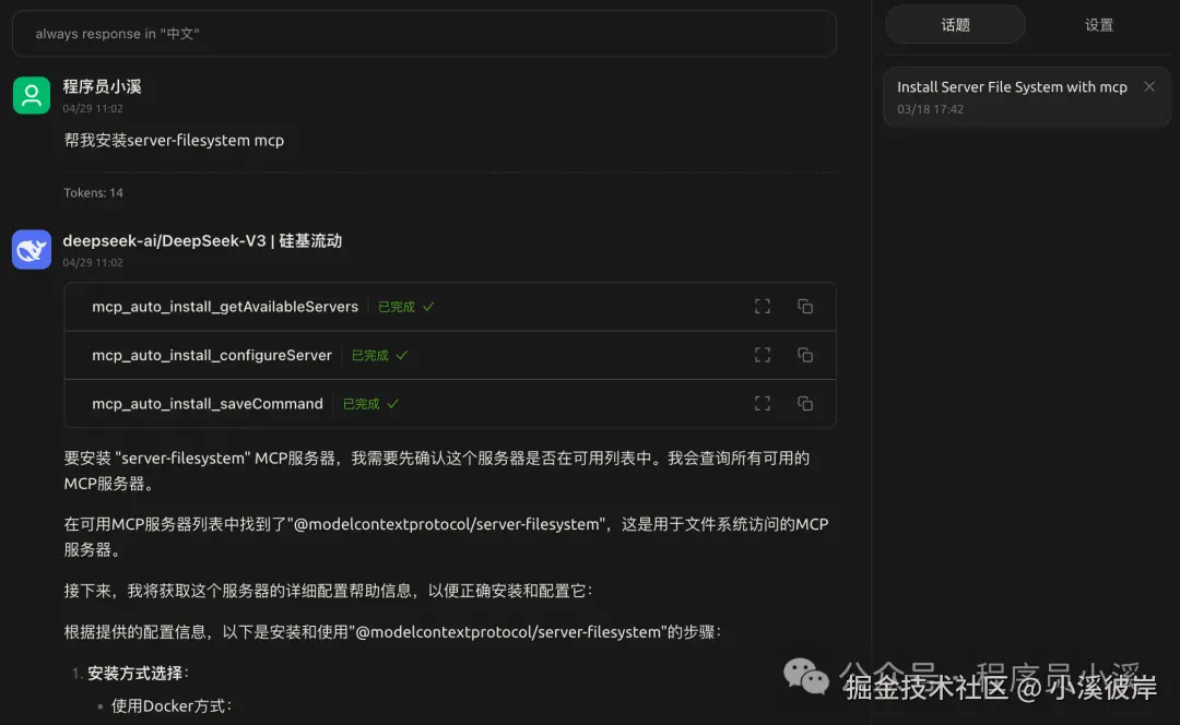 官方说自动安装的结果和模型有关,使用DeepSeek-V3实测只是给出了完整接入配置并没有真正的配置到客户端MCP中❌