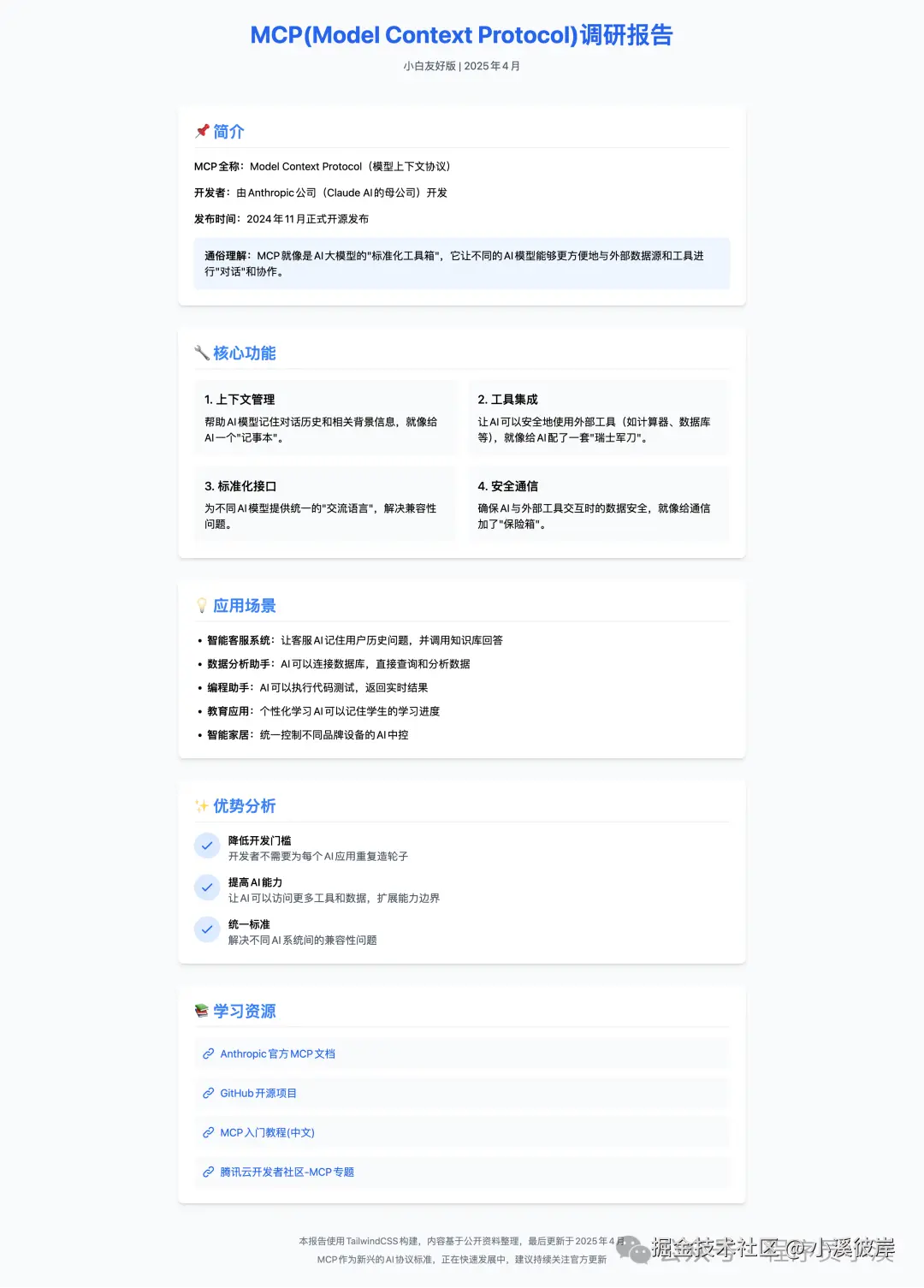 帮我整理一份对小白友好的MCP(modelcontextprotocol) 调研报告,请遵循以下要求: