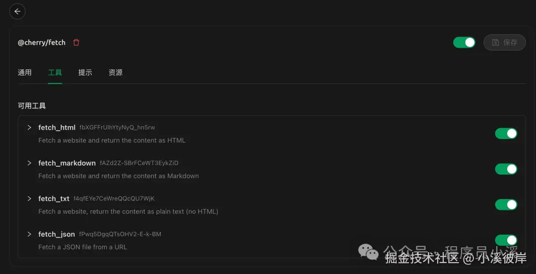 进入MCP详情可以看到服务也是自动启动的,点击【工具】可以查看MCP服务提供的工具列表